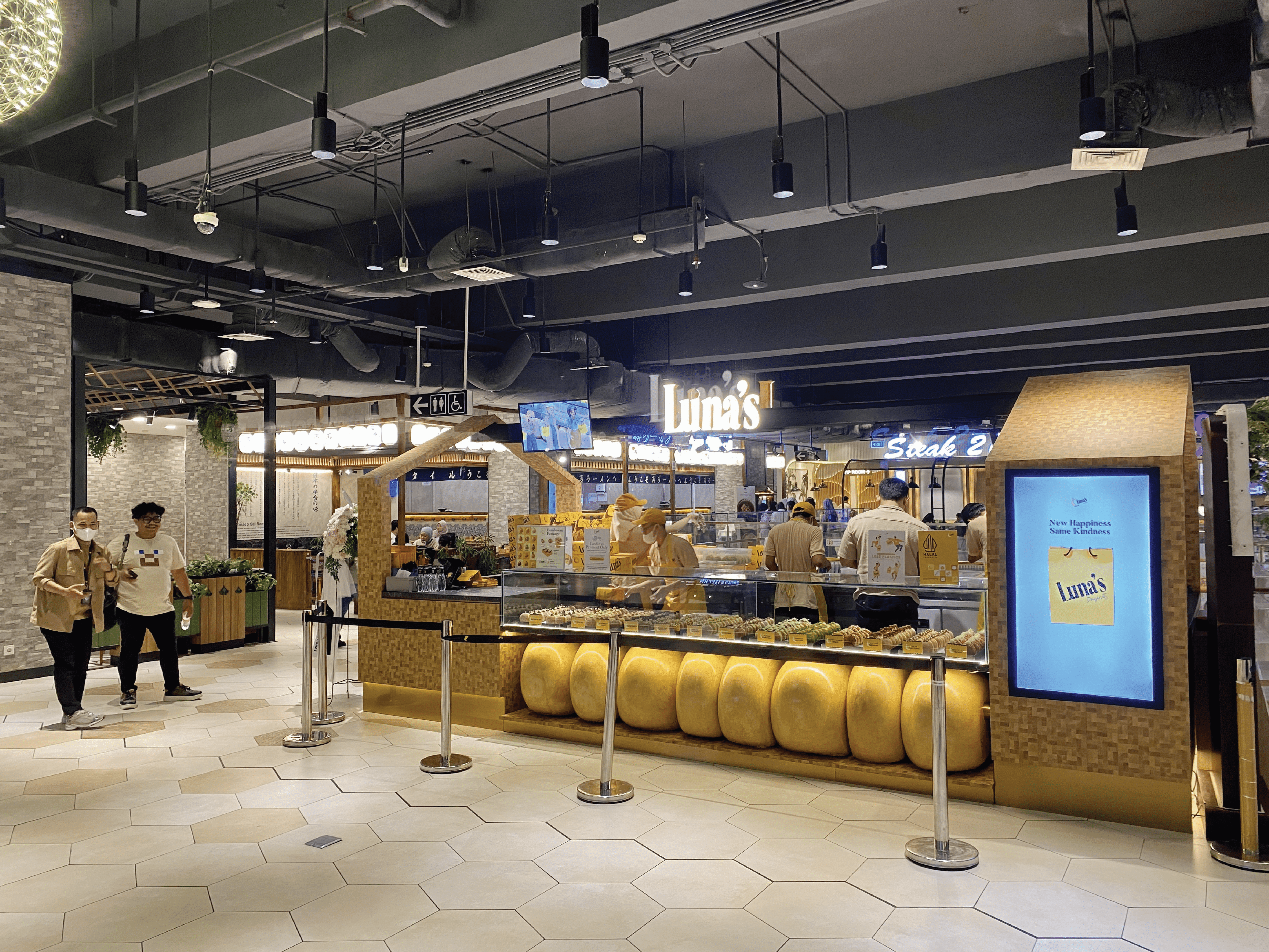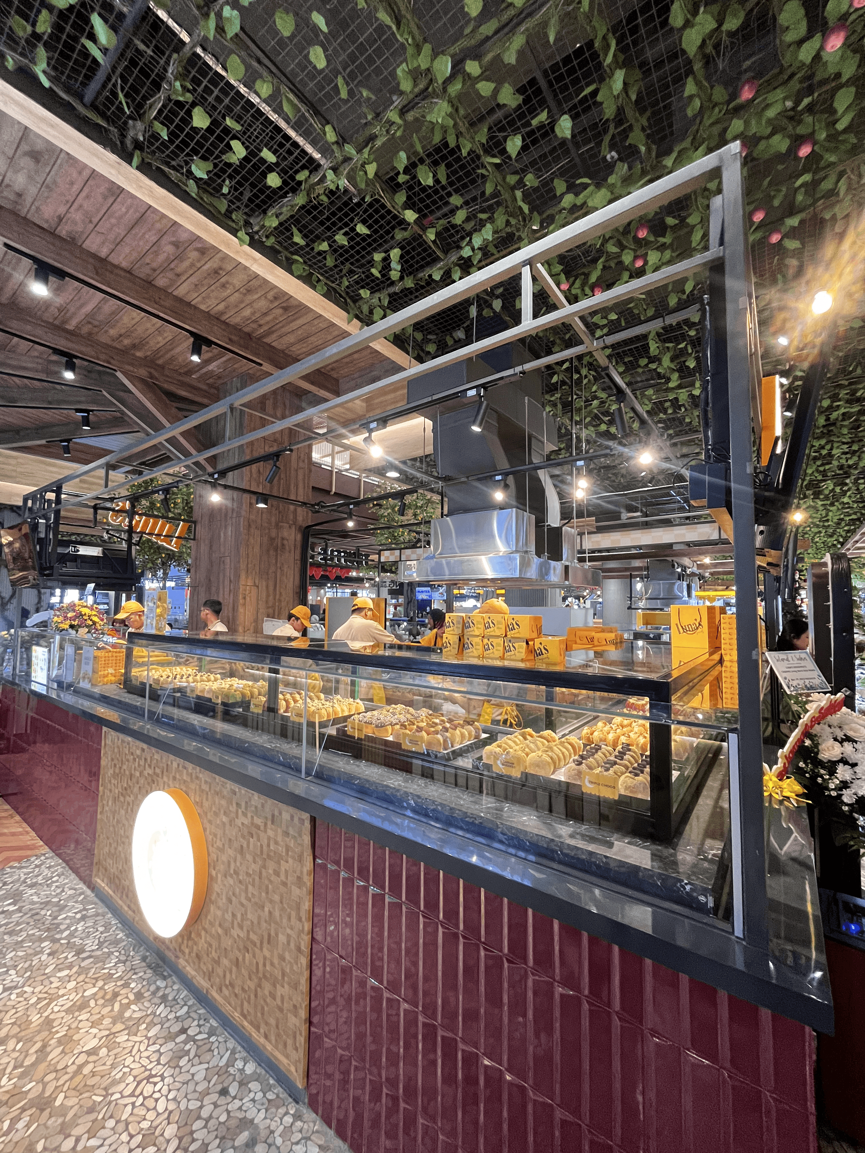 Compact setup for quick and easy grab and-go service, just pick your favorite doughnuts and you can see the donut making process.